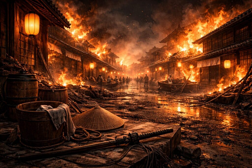 ――第五章 狐火の名―― 千鳥屋の炎は、深川の夜空を赤く染めた。 火の粉が川風に乗って舞い、提灯の灯と混じり合って、まるで狐火が無数に走るように見える。町人は叫び、桶を抱えて駆け、半鐘がやけに遅れて鳴り出した。だが、この騒ぎは人を救うため... -