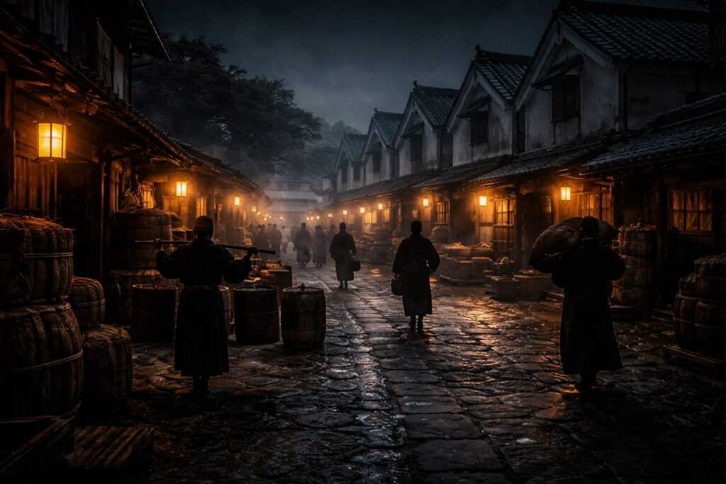 ――第三十一章 木場の奥―― 深川の木場は、昼と夜とでまるで別の顔を持つ。 昼は材木の山が陽を受けて白く乾き、木挽きの声や水路を行く舟の音が絶えぬ。だが夜になると、その材木の山はことごとく黒い壁に変わり、水は音だけになり、人の気配は木の匂... -