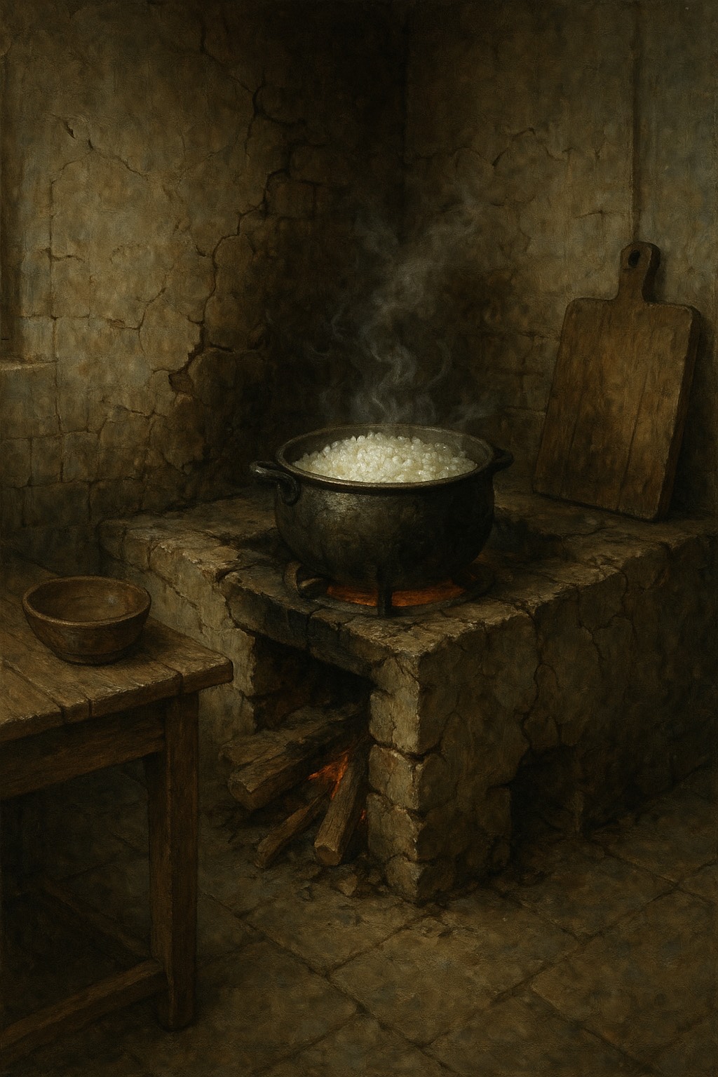 夜、釜戸の中に小さな火が灯った。湿った木がじりじりと音を立て、炎が赤く膨らむ。火が立つと、部屋の壁が柔らかく明るくなる。その明るさが、過去と未来の境界を曖昧にした。