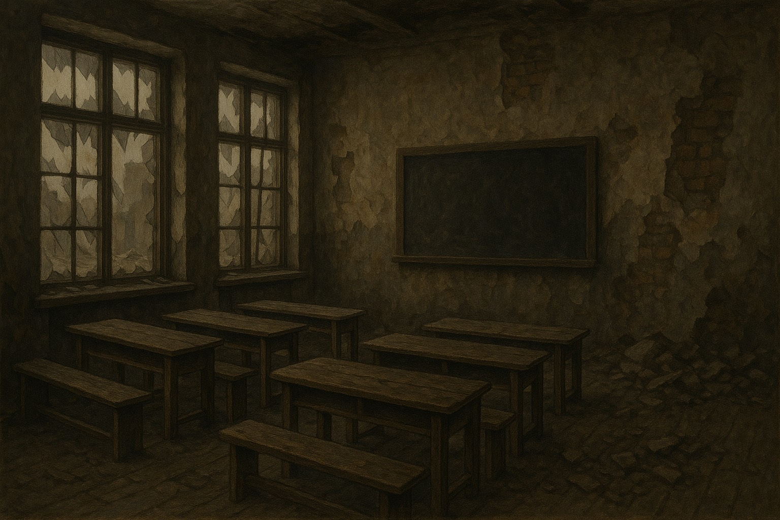 二人で教室に入ると、そこには机が十台ほど、ばらばらに置かれていた。焦げた跡がある机もあれば、脚が一本足りない机もある。黒板はひび割れ、端が欠けている。その欠けた部分にだけ、外の光がささやかな三角形を描いていた。