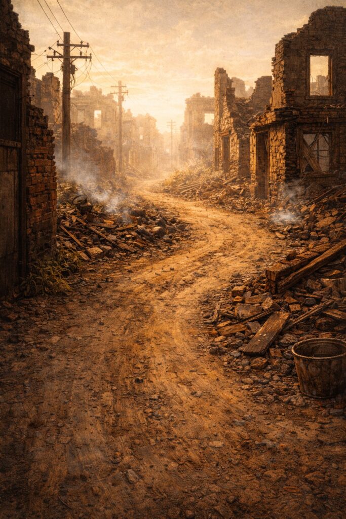 影の道を歩くと、昼間には角ばって見えた瓦礫が、夕方の光の中で丸く見える。