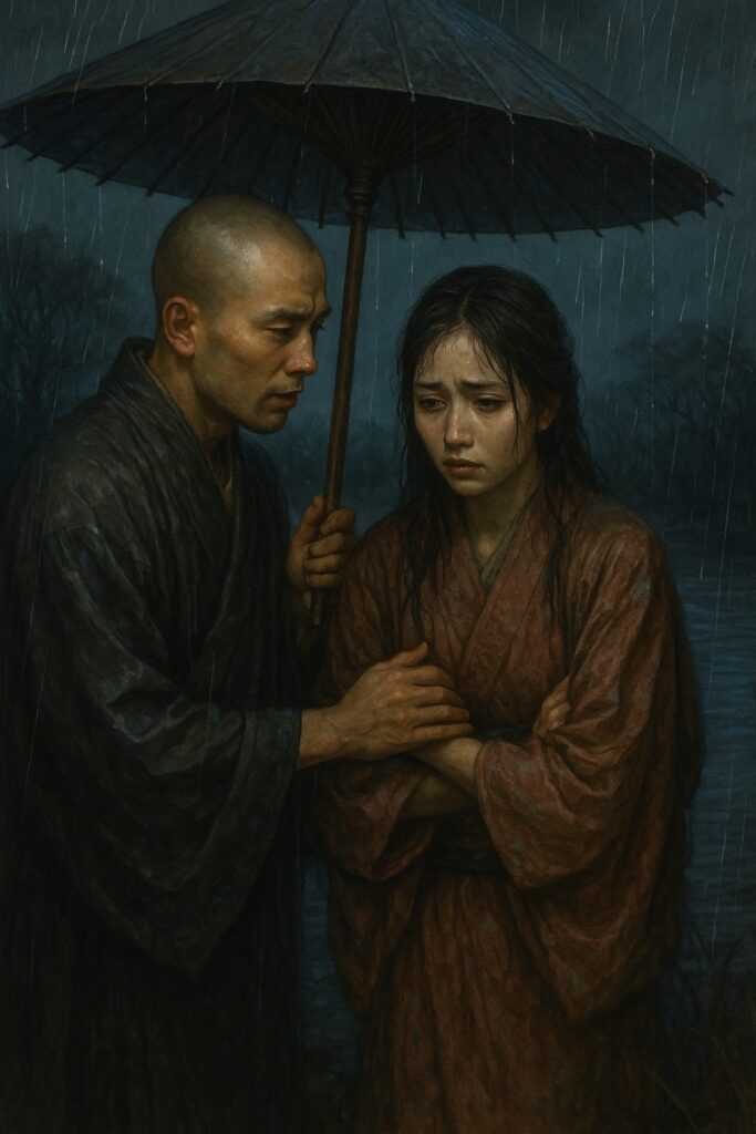 ある雨の夜、お玉は家を抜け出し、池のほとりに立った。